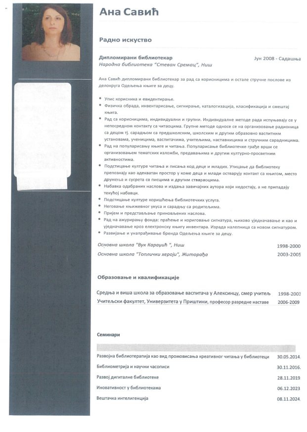 U CV-u Ane Savić navodi se da je ona od 2008. godine zaposlena u Narodnoj biblioteci “Stevan Sremac” u Nišu, a da je pre toga bila zaposlena u OŠ “Vuk karadžić” i OŠ “Toplički heroji” u Žitorađi. U delu obrazovanja navodi se da je Savić pohađala Srednju i višu školu za obrazovanje vaspitača u Aleksincu, smer učitelj i Učiteljski fakultet Univerziteta u Prištini. Govori ruski i engleski, a učestvovala je i na nekoliko seminara o bibliotekarstvu.