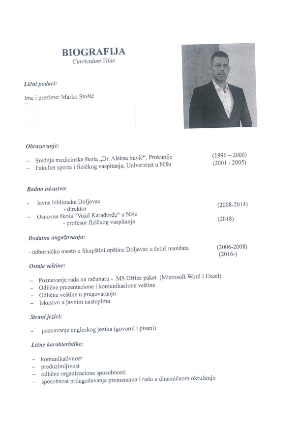 Stošića, navodi se da je od 2008. do 2014. godine bio na mestu direktora doljevačke Javne biblioteke, a pre toga profesor fizičkog vaspitanja u OŠ “Vuk karadžić”. Diplomirao je na Fakultetu sporta i fizičkog vaspitanja i završio srednju medicinsku školu “Dr Aleksa Savić” u Prokuplju.