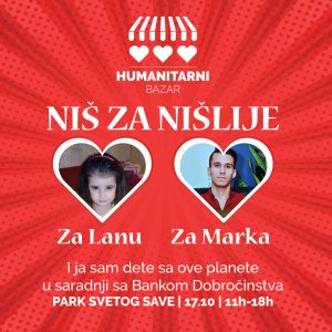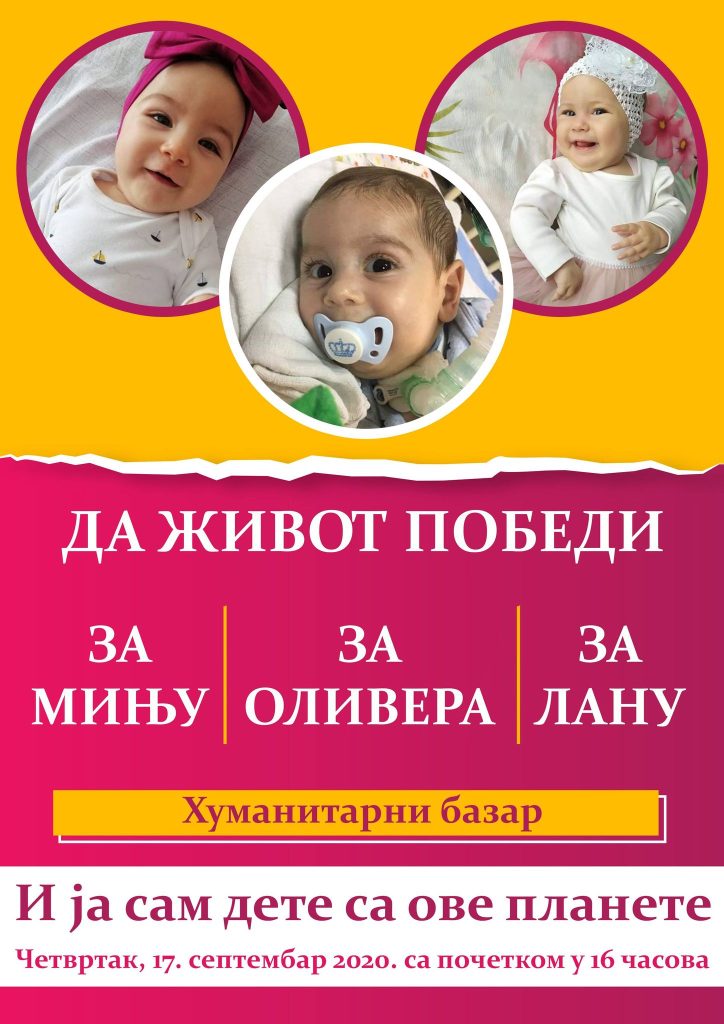Lana, Minja i Oliver boluju od spinalne mišićne atrofije i za njihovo lečenje u Americi potrebno je po 2,4 miliona dolara. Bazar će biti održan u četvrtak, 17. septembra u centru Niša sa početkom u 16 časova, a organizuje ga humanitarna grupa “I ja sam dete sa ove planete”. Na bazaru će se prodavati rukotvorine kreativnih Nišlija, a organizatori najavljuju i nagradnu lutriju.