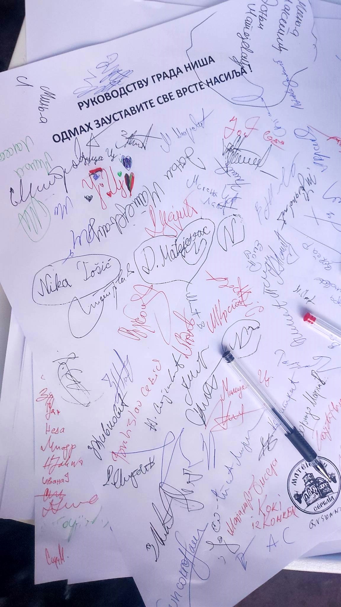 Tokom protesta okupljeni su mogli da se potpišu na listama gde je pisalo “Rukovodstvu Grada Niša – Odmah zaustavite sve vrste nasilja”. Od Skupštine je potom protestna šetnja krenula ka Trgu kralja Milana. Protest je završen ispred Gradske kuće, gde su i ostavljeni potpisi okupljenih. Podsetimo, Odluka o prestanku prava korišćenja pašnjaka i utrina selima Gornji Matejevac i Jasenovik doneta je 24. aprila na hitnoj sednici Skupštine Grada Niša. Zbog toga što sa meštanima o tome niko nije razgovarao, kao i zbog straha šta bi na brdu u koje gleda celo selo moglo da bude, Matejevčani su prvi protest organizovali 4. maja u selu, a 24. maja i blokirali ulicu ispred Skupštine Grada Niša. Na drugom protestu su najavljene i tužbe zbog, kako kažu, odluke koja krši više zakona.