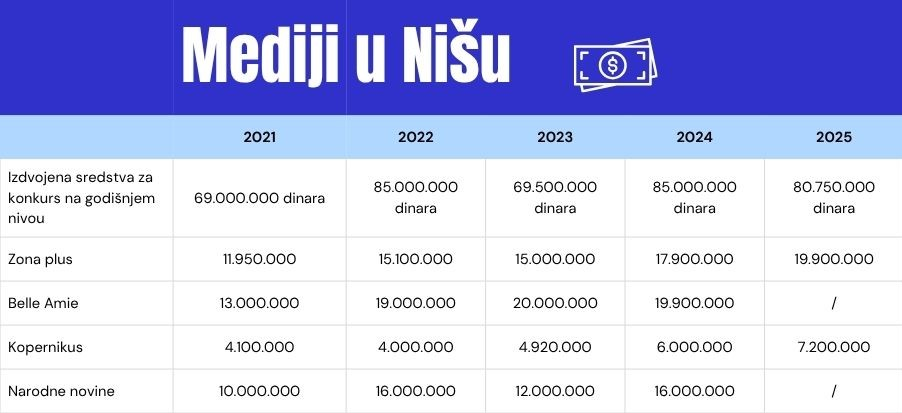 U periodu od 2021. do 2025. godine, gradovi Niš i Vranje izdvojili su oko 530 miliona dinara ukupno za sufinansiranje projekata iz oblasti javnog informisanja koji doprinose javnom interesu. Rezultati konkursa pokazuju da je, po pravilu, najviše novca odlazilo medijima bliskim vladajućoj Srpskoj naprednoj stranci, a da su o dodeli para odlučivali skoro uvek isti ljudi iz nekoliko istih udruženja.