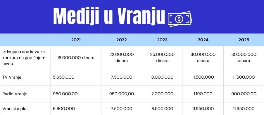 Dokaz da i u Vranju sredstva iz godine u godinu idu u iste ruke, pokazuje nam situacija i sa ovogodišnjeg konkursa – 2025. godine na konkursu u Vranju, čak 27,7 miliona dinara dodeljeno je medijima Vranjska plus i RTV Vranje od ukupnih 30 miliona koliko je izdvojeno iz gradskog budžeta.