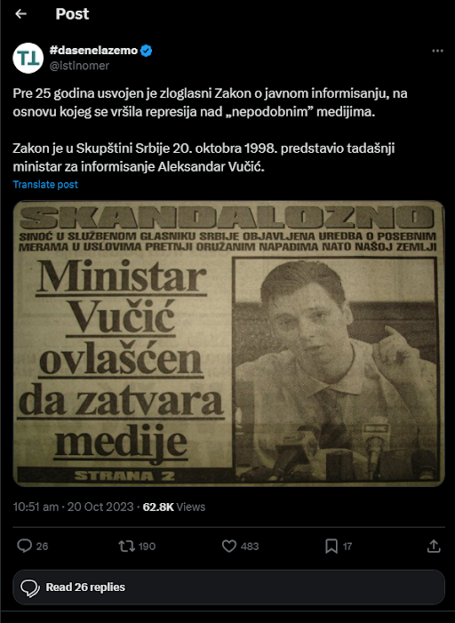Gotovo 20 godina kasnije, potpisnik spornog Zakona iz 1998. godine, kaže da je to bio “jako glup Zakon”, uporno ponavljajući da su u Srbiji danas mediji slobodni. Ipak, brojni međunarodni i domaći izveštaji, kao i organizacije demantuju predsednika Vučića, dok su ga Reporteri bez granica uvrstili na listu “Predatora medijskih sloboda” za 2025. godinu – rame uz rame sa Vladimirom Putinom, Viktorom Orbanom i Aleksandrom
