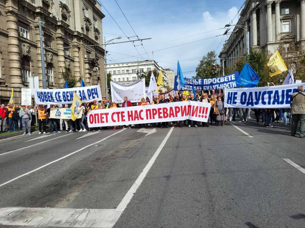 Danas je u Beogradu ispred Skupštine Srbije održan protest prosvetnih radnika četiri reprezentativna sindikata. Pod nazivom “Opet ste nas prevarili” protest okupio je nastavnike, profesore i vaspitače iz cele zemlje, među kojima su bili prosvetari iz Niša. Više od 90% škola u Srbiji je danas štrajkovalo, rečeno je na skupu.