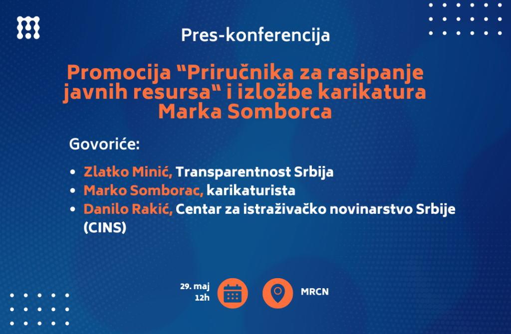 U sredu 29. maja od 12 sati u Media i reform centru Niš održaće se pres-konferencija koju organizuje Transparentnost Srbija povodom promocije „Priručnika za rasipanje javnih resursa”, izložbe karikatura Marka Somborca, koje vizuelno prate Priručnik, kao i medijske priče CINS-a koje su produkt istraživanja ove teme.