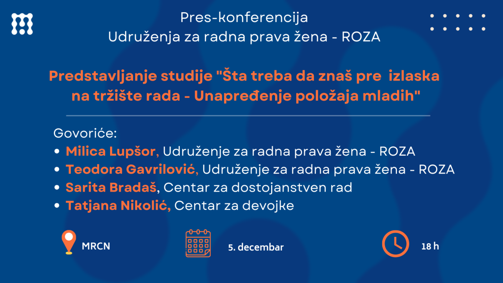 U utorak 5. decembra od 18 sati u Media i reform centru biće održana pres-konferencija povodom predstavljanja studije “Šta treba da znaš pre izlaska na tržište rada – Unapređenje položaja mladih”, a u organizaciji Udruženja za radna prava žena – ROZA iz Zrenjanina.