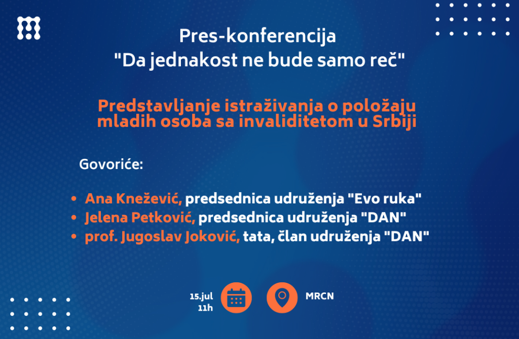 U ponedeljak 15. jula od 11 sati u Media i reform centru Niš održaće se pres-konferencija “Da jednakost ne bude samo reč”, u organizaciji udruženja “Evo ruka”. Na njoj će biti predstavljeni rezultati novog istraživanja o potrebama mladih sa intelektualnim teškoćama i njihovih roditelja na teritorijama Beograda i Niša.