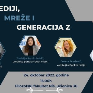 Ne davimo Beograd drži tribinu u NišuTribina: “Nove zeleno-leve snage u regionu: iskustva iz Hrvatske i Srbije” Tribina u Nišu – Razgovor sa narodnim poslanicama i lokalnim aktivistkinjama: „Ženska prava i (r)evolucija” Tribina: Mediji, mreže i Generacija Z “Mladi i mediji – kako prepoznati istinu u moru informacija?”