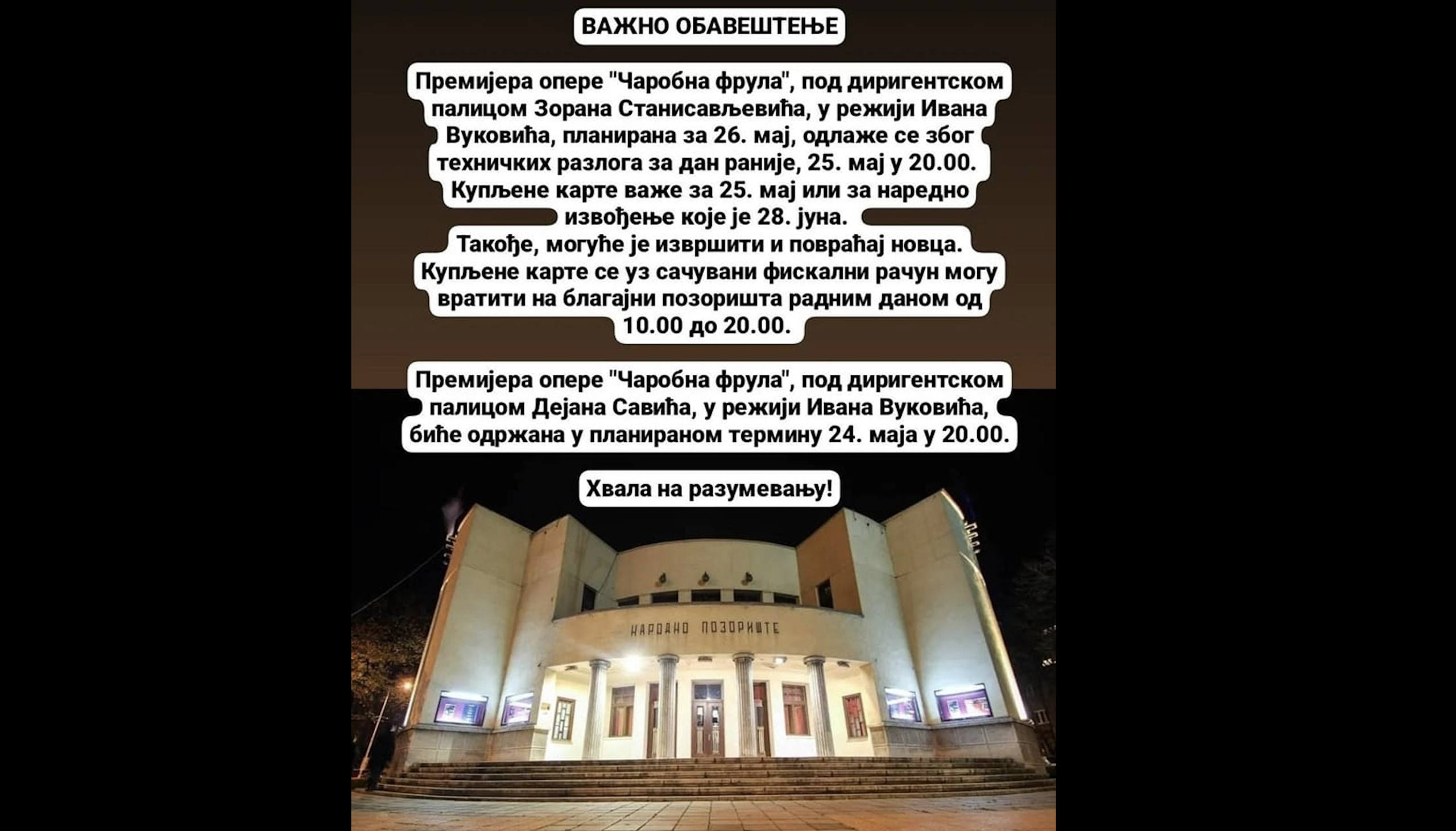 Narodno pozorište gde je najavljena opera Simfonijskog orkestra i Fakulteta umetnosti “Čarobna frula”, podelilo je sa svojom publikom da će premijera biti održana dan ranije zbog tehničkih razloga.